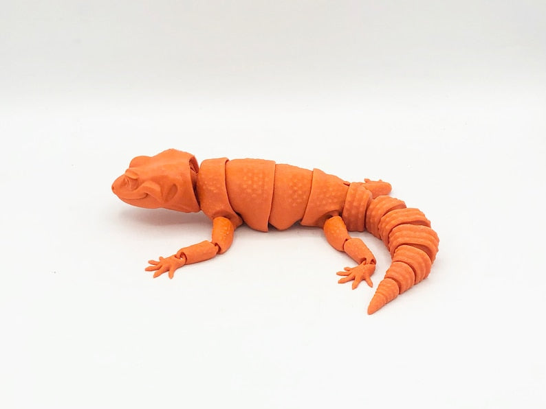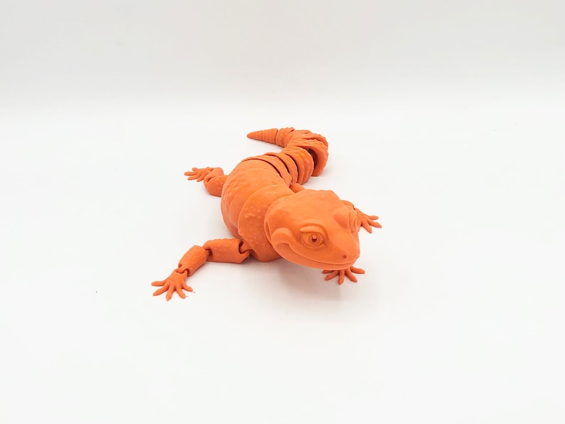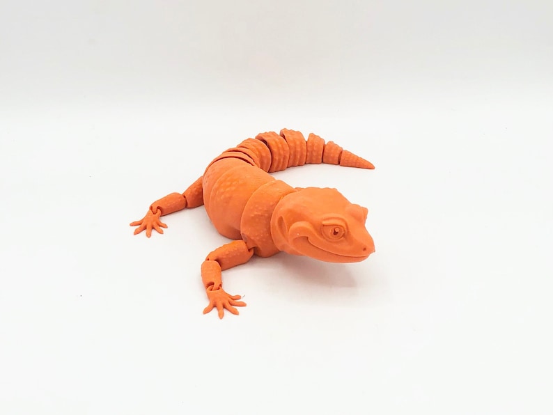 "Unleash your wild side with the Flexi Leopard Gecko! This 3d printed animal is the perfect addition to any desk or shelf. No need to worry about feeding or cleaning up after it (unlike the real thing). Grab one today and add some quirky fun to your space!"