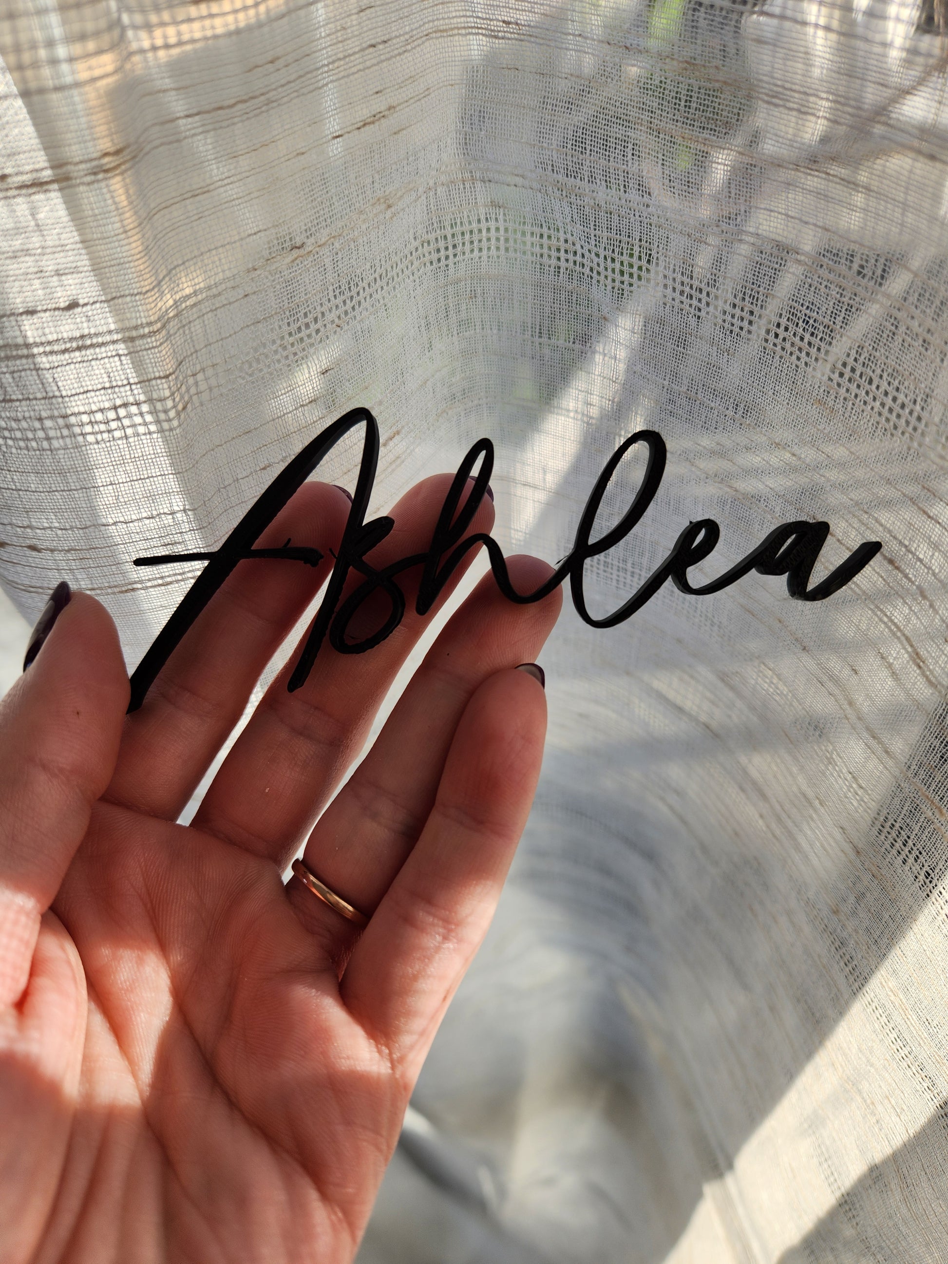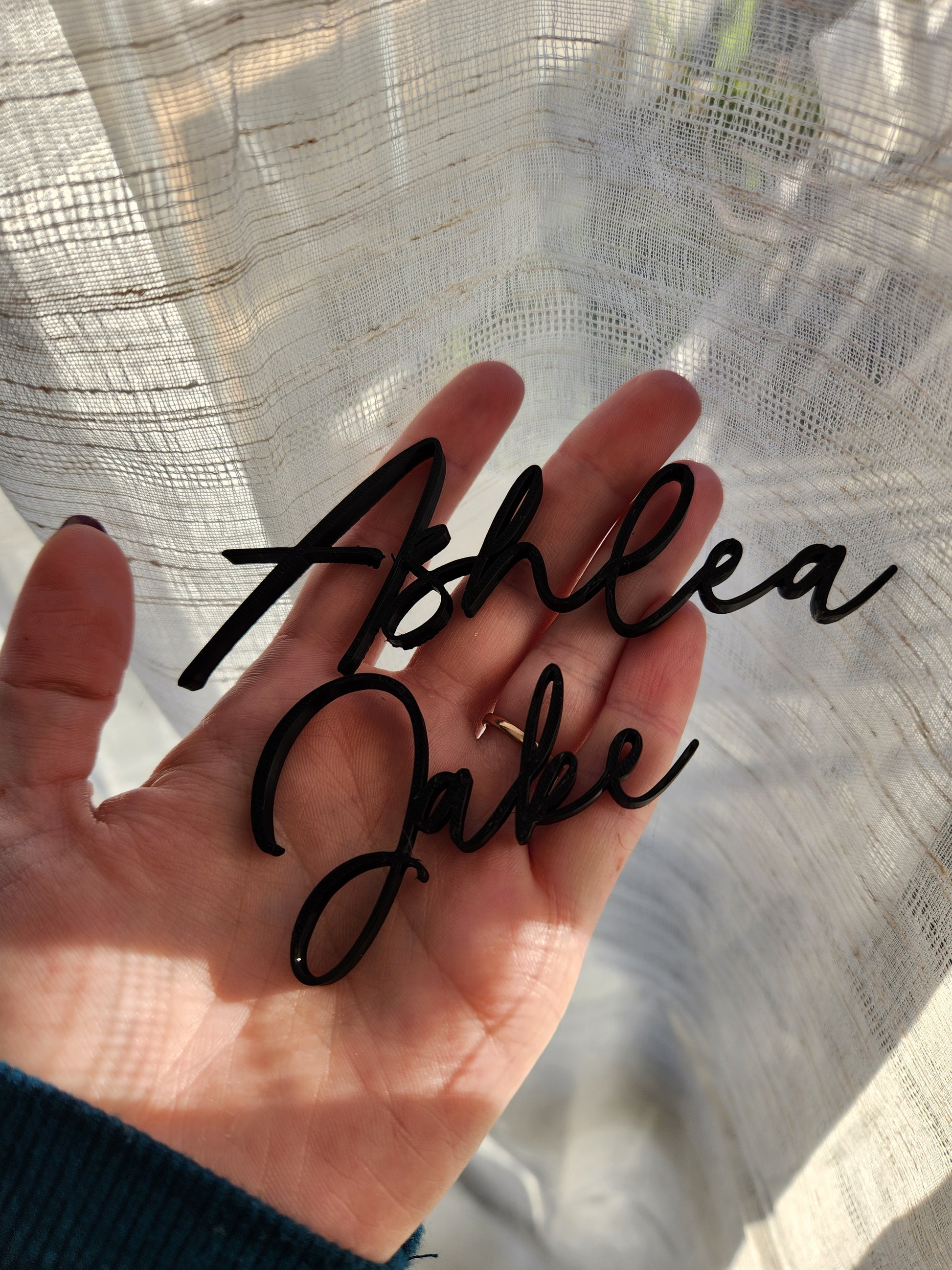 Elevate your wedding reception with a custom 3D-printed name place setting. Each piece is meticulously crafted to feature elegant typography and intricate designs, adding a personalized touch to your table. Available in a variety of colors and finishes, these name place settings are not only functional but also a stylish keepsake for your guests. Perfect for making your special day memorable and uniquely yours.